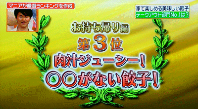 - TBS「ランク王国」お取り寄せ餃子人気TOP10で5位に入りました。